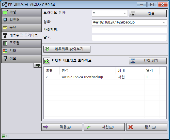 [네트워크 구성] 메뉴 내에 [네트워크 드라이브] 가 존재하며 네트워크 드라이브 연결을 위해 경로, 사용자명, 암호를 입력하여 연결하고 [확인] 버튼을 누른 후 나갑니다. (드라이브 문자를 지정하지 않으면 알아서 잡아 줍니다.)