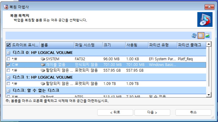 복구 파티션 외에도 Windows 가 설치된 C 드라이브도 복구를 해야합니다. 과정은 동일하며, 디스크 초기화는 필요 없습니다.