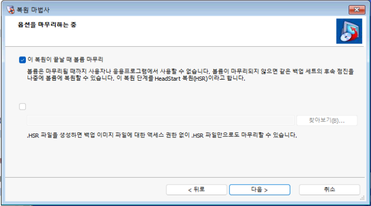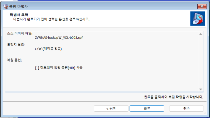 요약이며, [완료] 를 누르면 복원 작업이 시작됩니다.