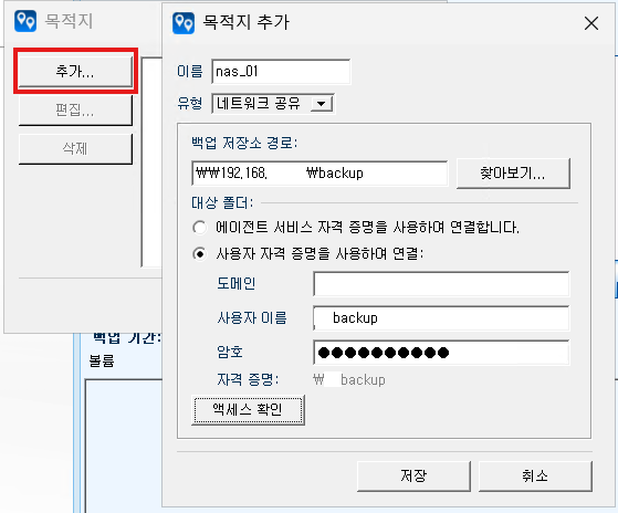 추가 버튼을 눌러 [네트워크 공유] 정보 입력