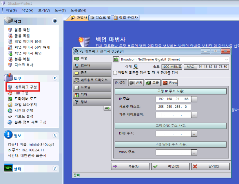 좌측 [도구] 에서 [네트워크 구성] 을 눌러 네트워크 설정이 가능하며 NAS 에 저장된 백업 데이트를 불러오기 위한 사전 작업입니다.
