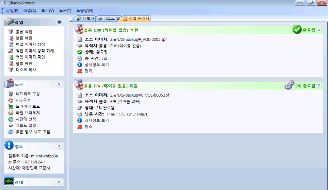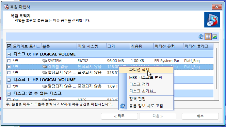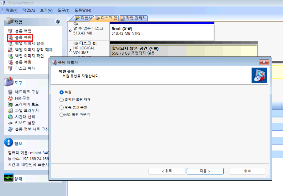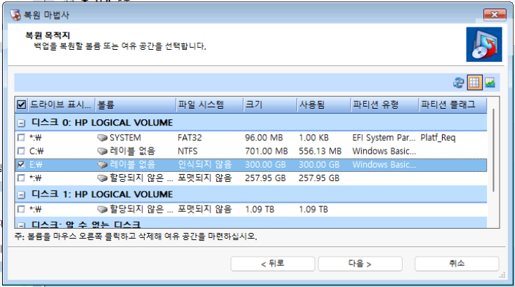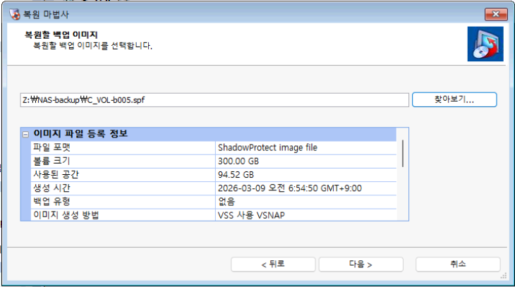 먼저, 복구 볼륨 부터 복원하겠습니다. 위에서 연결한 네트워크 드라이브를 통해 복원 지점의 백업을 불러옵니다.