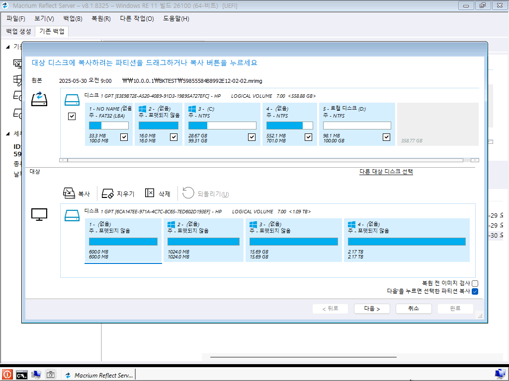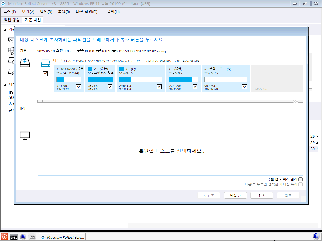 복원 시 특정 파티션만 복원하거나 기존 디스크에 대한 파티션 작업을 할 수 있습니다. 저는 전체 선택 후 넘어갔습니다.
