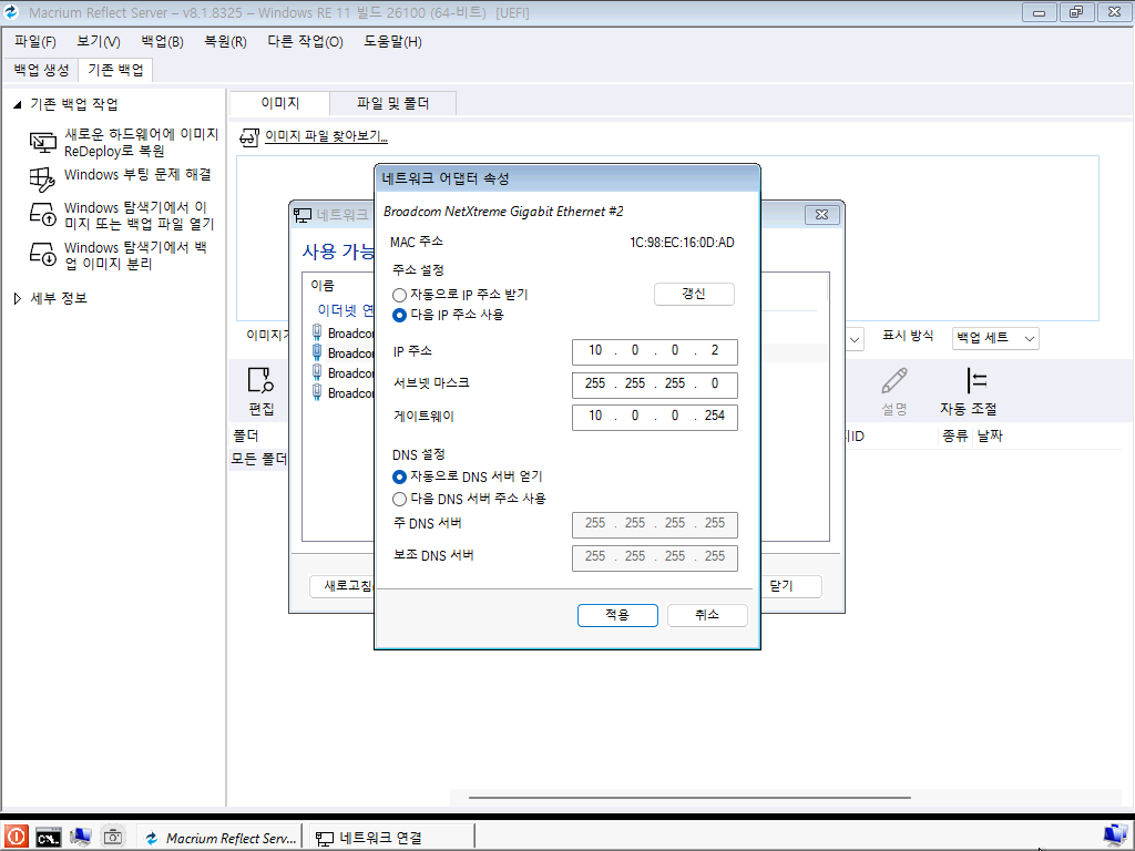 네트워크 드라이브에 있는 백업 이미지를 불러오기 위해 네트워크 설정을 진행합니다.