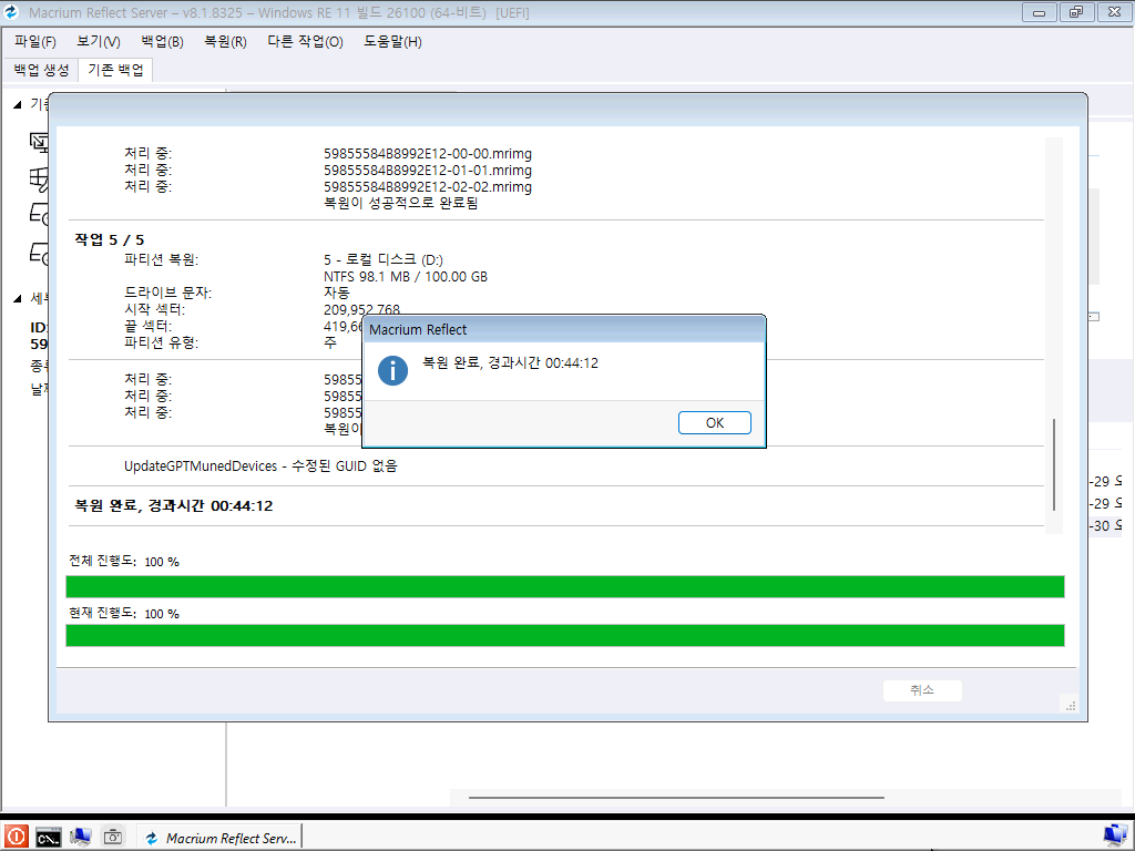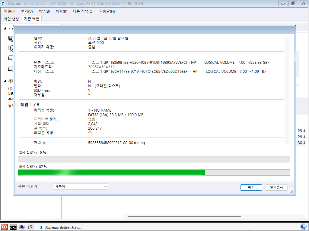 복원 관련하여 최종적으로 설정들을 다시 확인하고 [완료]를 누르면 복원 작업이 진행됩니다.