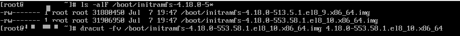 dracut -fv /boot/initramfs-4.18.0-553.58.1.el8_10.x86.64.img 4.18.0-553.58.1.el8_10.x86.64